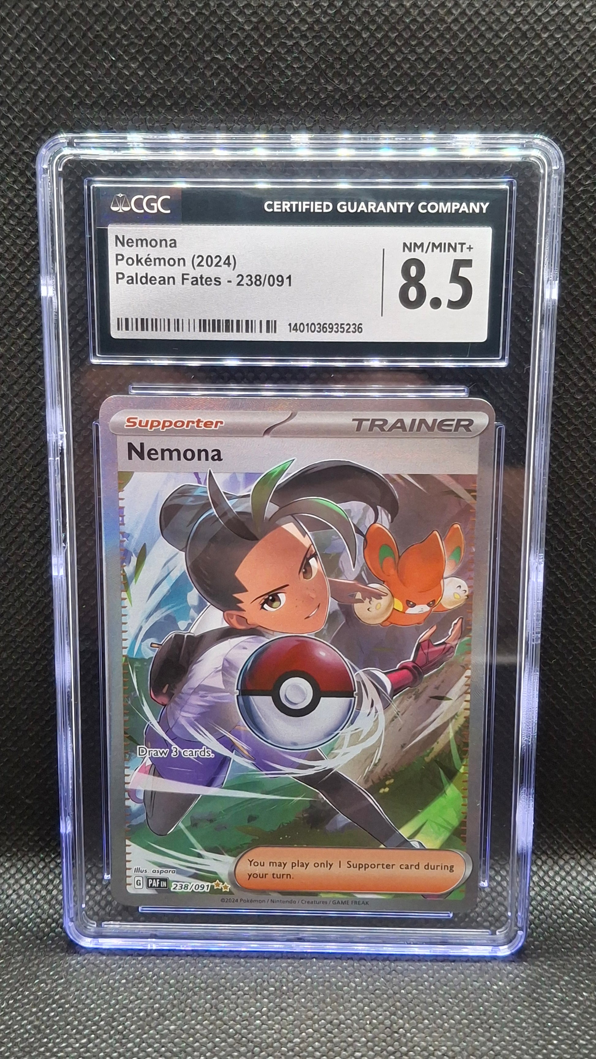 The Nemona Pokémon (2024) Paldean Fates card, graded CGC 8.5, exemplifies high quality in collectible card standards. This card captures the character of Nemona, offering both aesthetic appeal and investment potential, as higher-grade cards often appreciate in value over time, reflecting rarity and demand within the Pokémon community.